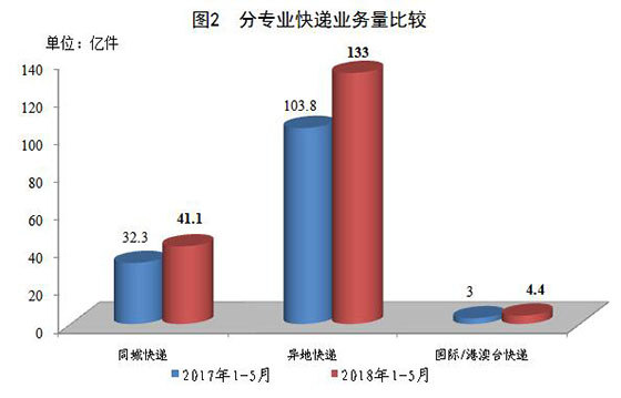 1-5月,同城、异地、国际/港澳台快递业务量分别占全部快递业务量的23%、74.5%和2.5%;业务收入分别占全部快递收入的15.1%、50.5%和10.9%。与去年同期相比,同城快递业务量的比重下降0.3个百分点,异地快递业务量的比重下降0.1个百分点,国际/港澳台业务量的比重上升0.4个百分点。