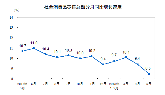 据国家统计局统计,中国5月社会消费品零售总额同比8.5%,预期9.6%,前值 9.4%。