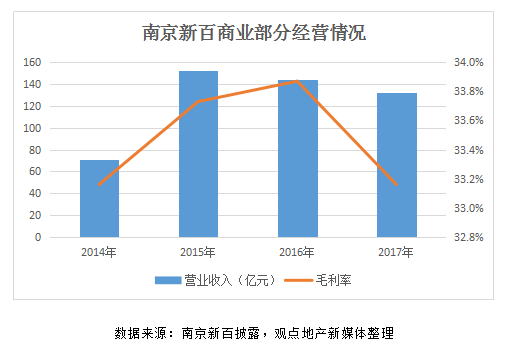 截止2017年底,HOF资产总额95.67亿元,资产净额18.44亿元,在南京新百分别占比39.01%、23.02%;营业收入108.25亿元,为南京新百贡献比则达60.27%。受制于HOF销售情况不理想,南京新百的商业业务也持续出现萎缩迹象。