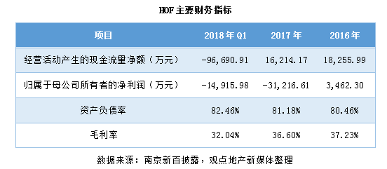 主要财务指标方面,2016年、2017年及2018年一季度,HOF资产负债率逐年上升,分别为80.46%、81.18%及82.46%,意味着较高的资产负债率使其面临较大的经营和偿债压力。与此相对应,HOF的毛利率则从37.23%下滑至32.04%。