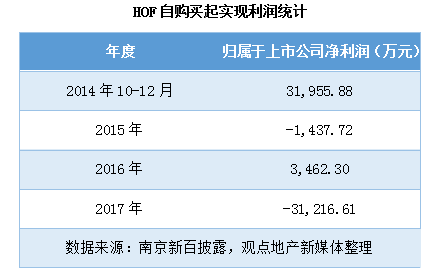 2014年下半年,在袁亚非推动下,三胞集团将HOF共89%股权注入南京新百,并于当年8月下旬获得中国证监会批准。按照南京新百公告,2014年10月至2017年底共38个月内,HOF累计为上市公司贡献的净利润仅2763.85万元人民币,其中2017年净亏损达3.12亿元。