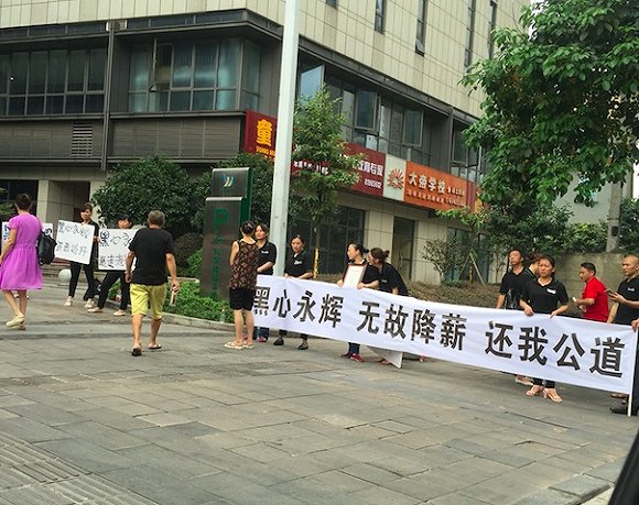 7月25日,股票资讯软件上,一位名为“不要想东想西”的用户发布了重庆永辉员工维权的图片,几名身着永辉员工服的人员拉着“黑心永辉、无故降薪、还我公道”的横幅。该用户称,事发地是永辉重庆总部楼下。
