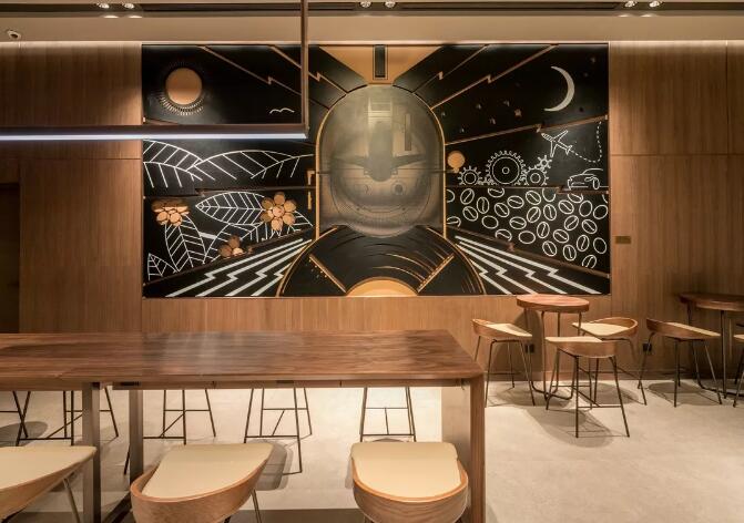 据观察,连接一楼和二楼的楼梯采用胡桃木材质,而楼梯侧的墙上绘有全球第一家西雅图Roastery设计手绘稿,展示着这家标杆性的门店最开始的模样。穿过楼梯,到达二楼,消费者可以一幅巨型金属雕刻,超现实主义的咖啡烘焙机形似一个巨大的火车头。