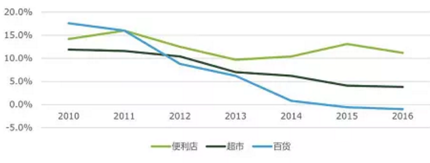 前几年,在电商的冲击下,满足消费者即时消费需求的便利店曾是受电商影响最小的业态。根据中国连锁经营协会发布的《2017年中国连锁百强》显示,便利店是实体零售企业中增长最快的业态,百强便利店企业 2017 年销售增长率为 16.9%,门店数量增长为 18.1%。