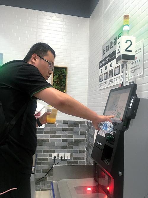 鹤岗市比优特超市内,一位年轻人正通过扫描商品进行自助结账业务。