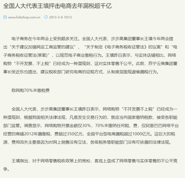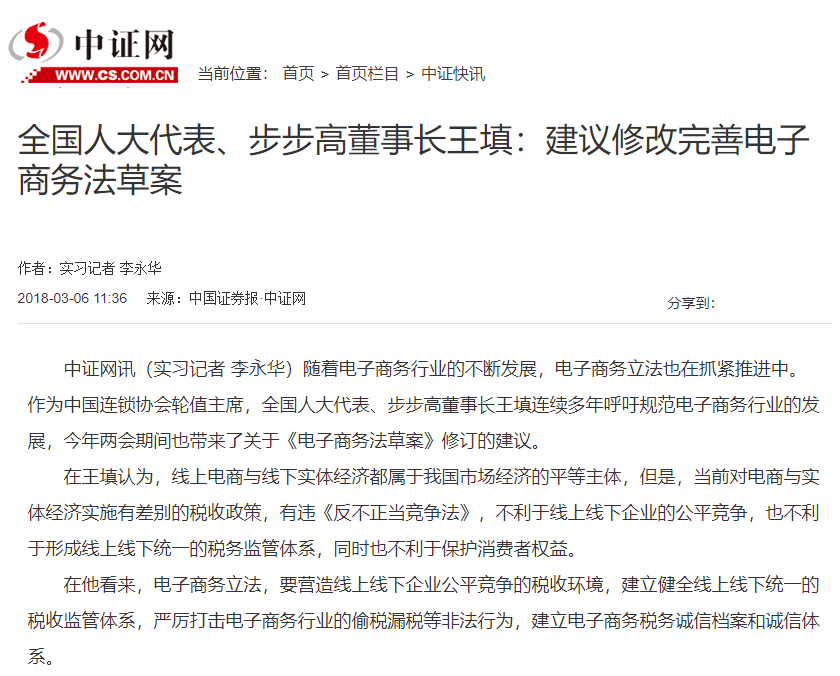 《人民日报》报道说,“电商近年来增速很高,其中固然有技术进步的推动,但更多与逃避税收、低价倾销等带来的不正当竞争优势有关。”步步高集团董事长王填对记者直言。作为全国人大代表,今年两会期间,他提交了关于推进电商公平纳税征管办法的议案。王填说,进入“新零售”时代,线上线下将会高度融合,电商公平纳税到了必须切实解决的阶段,以便营造实体和电商公平竞争的环境。