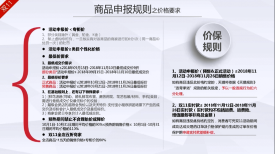 2、另外今年双11为履行“双十一”品牌对消费者的服务承诺、提升消费者的购物体验,2018双十一活动结束后15天内(2018年11月12日00:00:00-2018年11月26日23:59:59)为价格保护期,其销售价格不得低于双11活动价格,如有违反的,天猫会按照《天猫规则》相关规定,予以一般违规行为扣六分处理。活动后15天内消费者实付款的金额不能低于双11当天的实付款金额,如有违反的,消费者有权申请差价补偿。建议商家在活动结后的15天内关注商品价格及优惠的设置情况,避免不必要的降价产生。