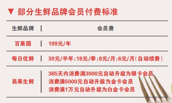 实际上,百果园付费会员的玩法,在实体生鲜连锁品牌中尚属先例,但在整个生鲜电商领域并不乏“尝鲜者”。易果生鲜的会员付费标准为,365天内消费满3000元、5000元和1万元而自动升级为银卡会员、金卡会员和白金卡会员。