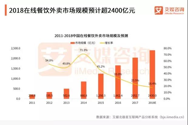 2018在线餐饮外卖市场规模预计超2400亿元。根据上述数据显示,中国在线餐饮外卖市场规模每年保持两位数扩张速度,2017年外卖市场规模突破2000亿元大关,2018上半年中国在线餐饮外卖市场规模已超1250亿元,预计2018年全年整体市场规模将达到2430.0亿元。艾媒咨询分析师认为,经过近几年外卖服务的普及,其市场发展已进入稳定增长期,在线餐饮平台竞争重点应从增量转向用户存量的挖掘,逐步转移到配送效率、服务体验、食品安全的优化。