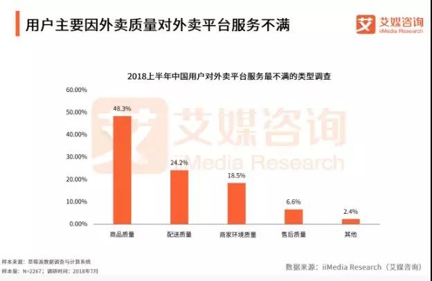 48.3%的受访用户表示对在线餐饮外卖平台服务最不满的类型是商品质量,如包装不佳、外卖不卫生等,另外,考虑配送质量、商家环境质量和售后质量的用户分别有24.2%、18.5%和6.6%,食品安全是广大消费群体的最大关注点。