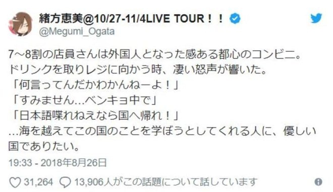 日前,知名日本声优绪方惠美在 Twitter 发文表示自己走向收银处的时候,突然听到客人在责骂店员。“我听不懂你在说什么!”一名外国店员马上道歉,“对不起……我还在学习”然后,客人说“不懂说日语就滚回自己的国家啊!” 绪方惠美则以此事呼吁日本人应该对外国人展现温柔的一面,好好对待他们。