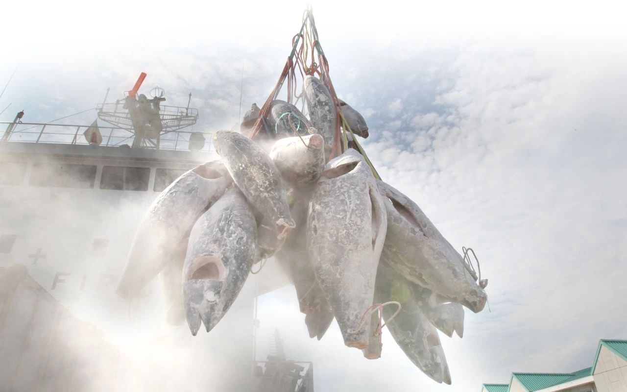 每条金枪鱼被标上号,鱼身上贴上写着产地及重量的标签。鱼尾部分被切掉,便于判断肉质的好坏。