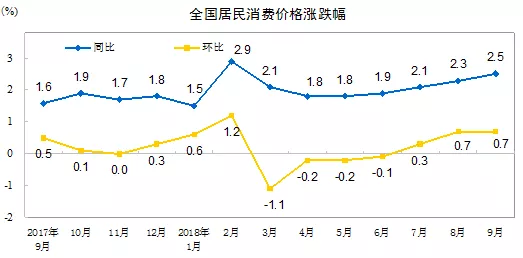 10月16日,国家统计局网站公布9月份消费数据。2018年9月份,全国居民消费价格同比上涨2.5%。其中,城市上涨2.4%,农村上涨2.5%;食品价格上涨3.6%,非食品价格上涨2.2%;消费品价格上涨2.7%,服务价格上涨2.1%。1-9月平均,全国居民消费价格比去年同期上涨2.1%。
