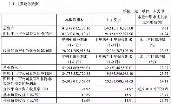 10月28日,贵州茅台发布2018年第三季度未经审计报告显示,1-9月公司营收为522.4亿元,同比增长23.07%;归属于上市公司股东的净利润为247.3亿元,同比增长23.77%。