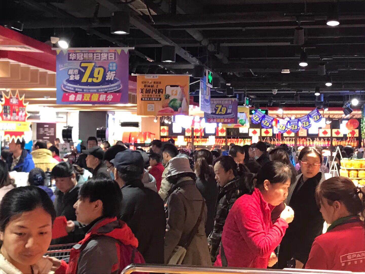 首先印入眼帘的是熙熙攘攘抢购的顾客和铺天盖地的活动宣传。