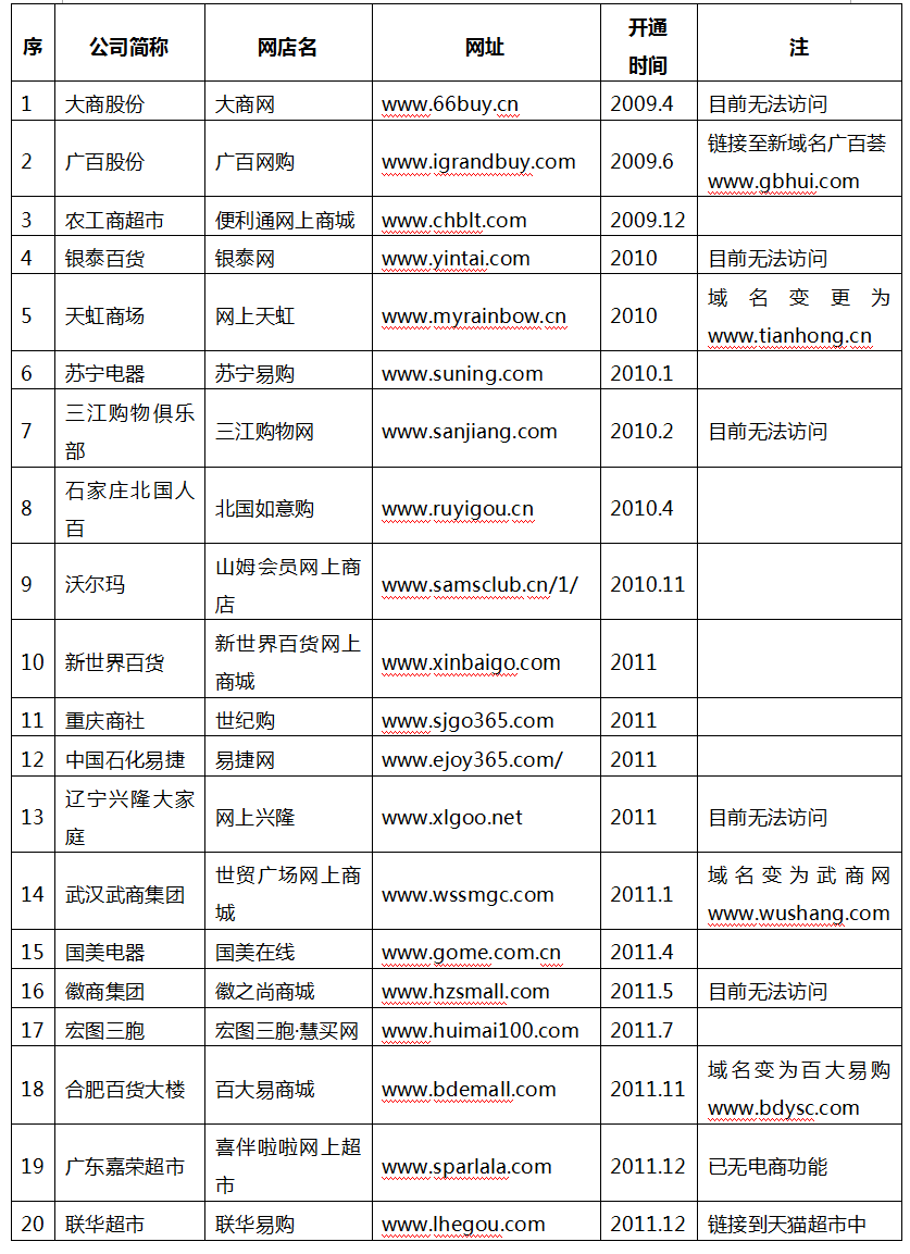 实体零售开展网络零售真正起步是在2010年前后,不完全统计,在2009-2011年间共约有20家具有一定规模的零售商开通了电商网站。这20家企业网站,目前有5家网站已无法访问,4家域名变更,1家无电商功能,1家链接到天猫平台。2012年,主要100家零售商中,有62家开展了PC电商业务,目前剩余不到一半。
