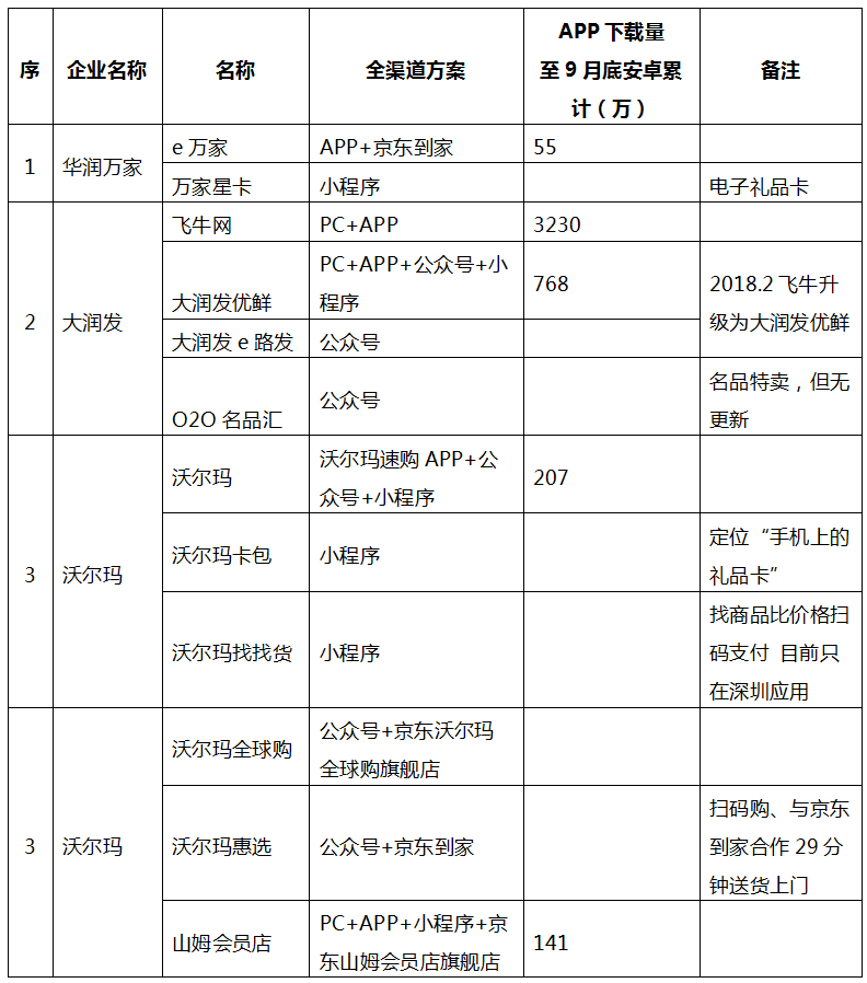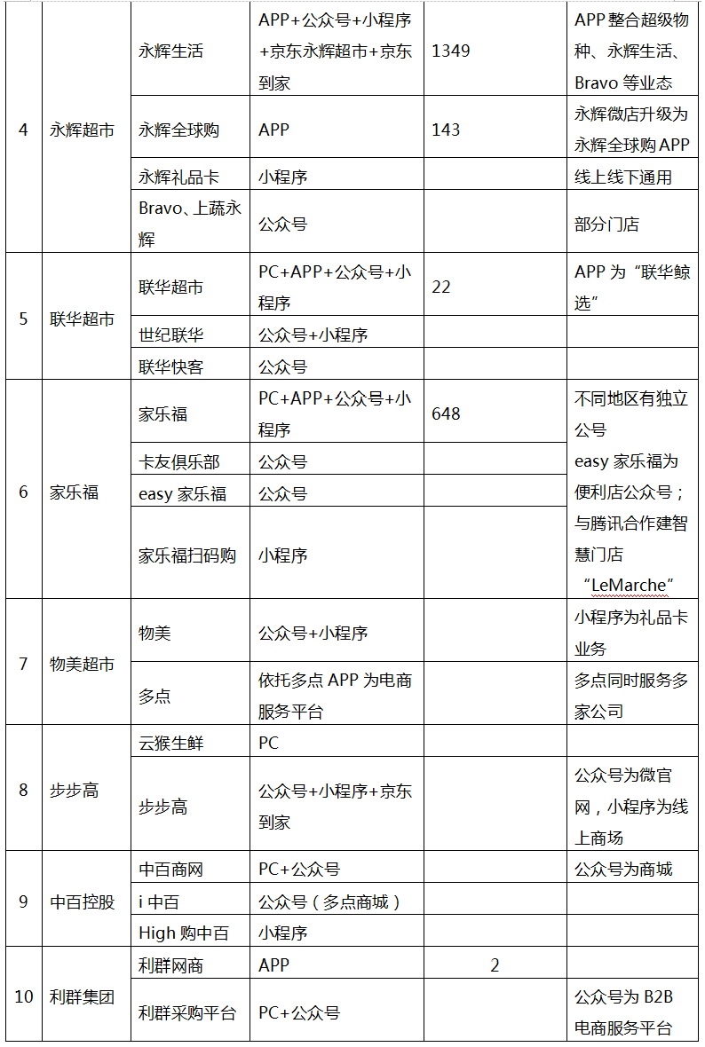 从表中我们也看到,超市行业的各类平台存在品牌不统一、渠道较为分散的情况,影响品牌的统一和流量的聚合,有进一步整合的空间。