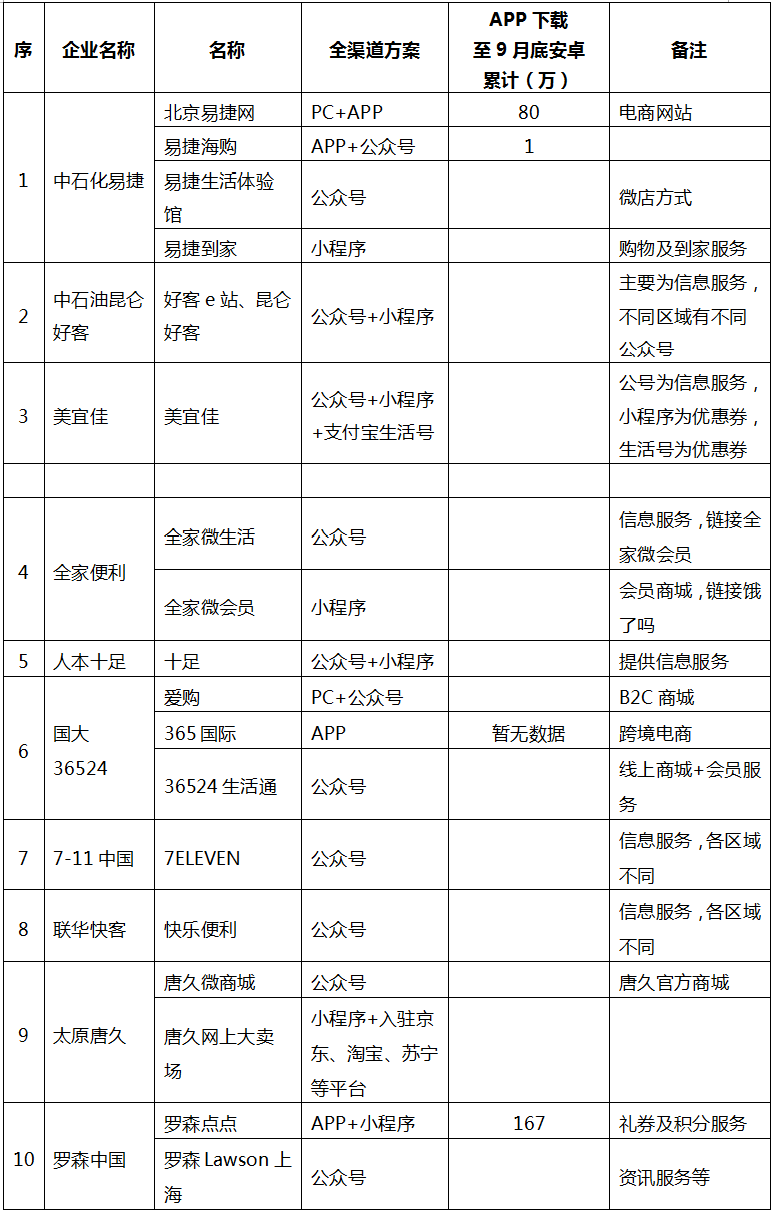 为便于比较分析,分别选取了百货、超市、便利店、专业店四个业态的主要10家企业,研究其目前的全渠道方案。