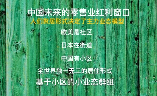 如果你仔细想一想,中国的一个小区一般有3000户就是1万人,一万人在欧美是一个大型的小镇。在欧美,一个小镇就会有一家大卖场很多的商业配套。所以你们可以试想中国未来的小区会迸发出什么样的红利?