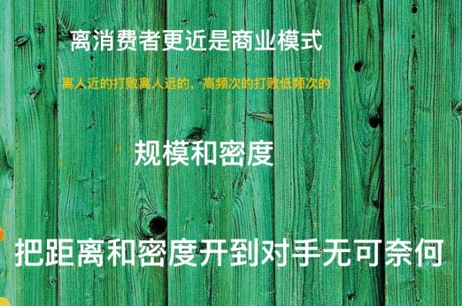 现在消费者巨大的变化是要求便利、新鲜,所以离消费者更近,不再是一种方法而是一种模式。我们原来选址,喜欢选十字路口,现在我们不需要这种地方,需要的是离小区门口最近的地方。另外,现在很多零售商都说规模很重要,规模固然重要,但密度更重要,在没有密度的情况下,盲目跑规模,只会得不偿失。所以我们经常讲未来的零售,尤其未来的小区零售,就是把你的距离和密度让对手无可奈何。