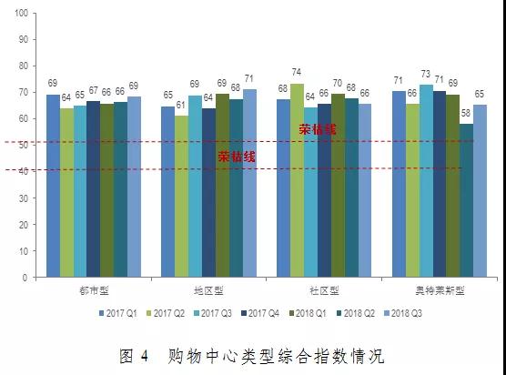 2018年第三季度中国购物中心综合指数录得67.1,环比上升1.0,同比上升0.3,且高出荣枯线17.1。整体市场保持健康向上的态势。