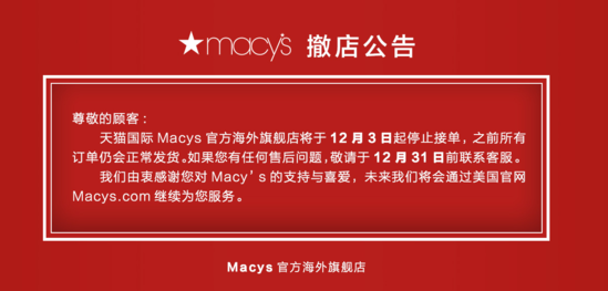 12月4日消息,梅西百货昨日发布撤店公告,天猫国际Macys官方海外旗舰店从12月3日起停止接单。
