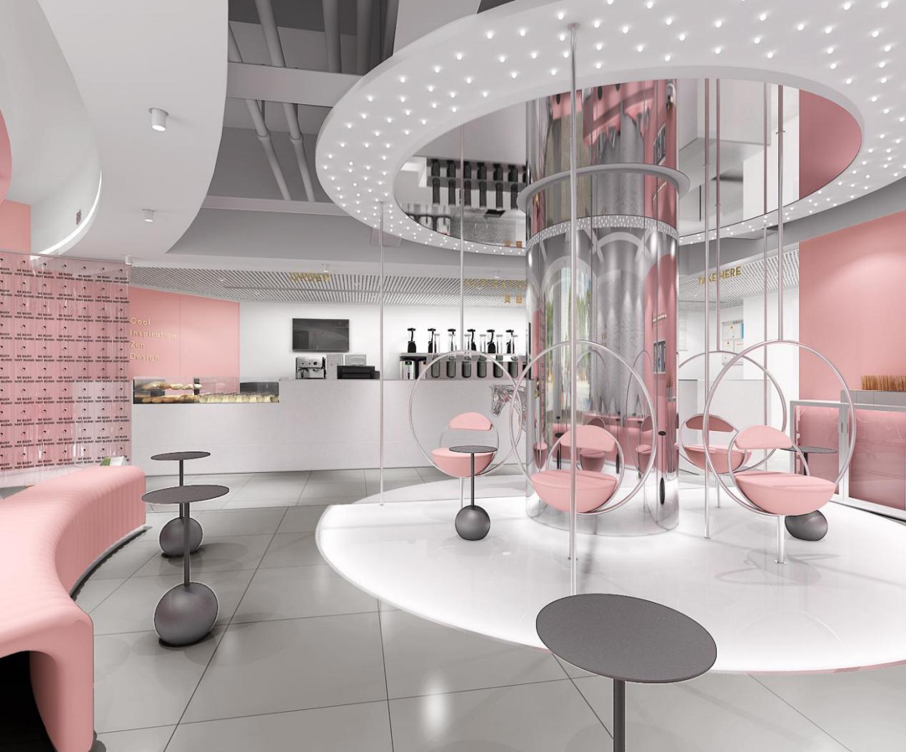 店内以“粉色世界再小也容得下旋转木马” 为设计理念,整个空间以立柱为原点放射状展开,视觉中心是旋转木马装置,坐上中轴可360度旋转的座椅。坐在PINK店里,抬头可见镜面天花的繁星点点,凭借粉红色自带的少女般可爱与任性,营造跳跃的美学趣味,而且店还将推出当季限定新品:紫米芋泥茶、紫米波波茶和芋泥波波茶。