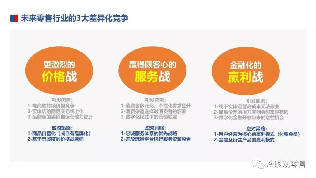 - 于零售而言,传统零售业:以商品为中心、密集劳动力、价格营销、位置为王的时代阶段很快就要划上句号了,还没有意识到这一点的企业,都差不多垂死挣扎了。