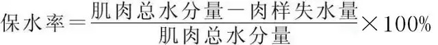 在第1~2腰椎背最长肌处切取1.0mm厚的薄片,平置于干净橡皮片上,再用直径为2.523cm的圆形取样器(圆面积为5cm2)切取中心部肉样。计算保水率时,需在同一部位另采肉样50g,按常规方法测定含水量后按下列公式计算:
