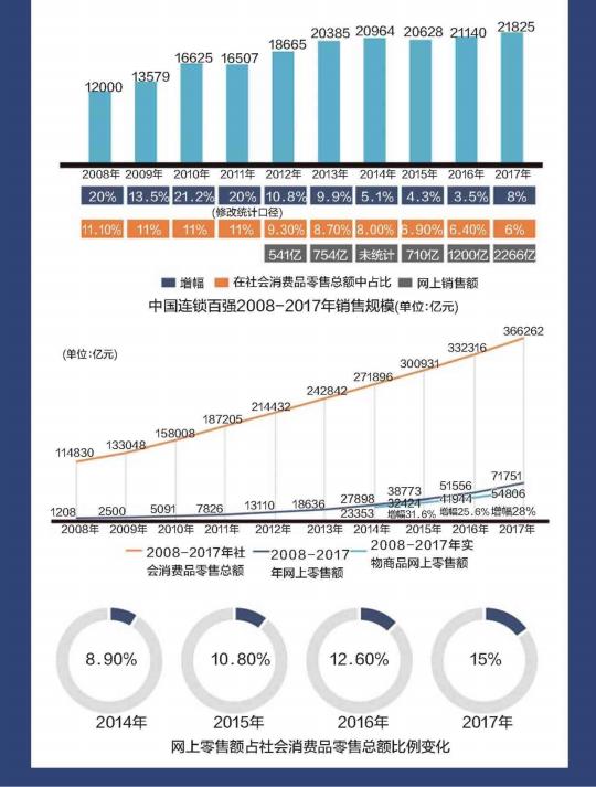 2017年,中国连锁百强企业线上销售增幅为78.9%,高于上一年的69%的水平,也远高于全国网上零售32.2%和百强线下销售8.0%的增幅。