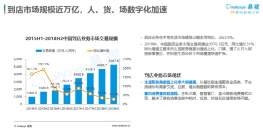 龙商网消息:1月15日,易观发布的《2018中国本地生活服务市场年度盘点》显示,2018全年,中国本地生活服务市场的线上交易规模达到15620.7亿元,同比增长56.3%。到店业务市场线上交易规模达9976.3亿元,在整个本地生活市场线上交易中占比 63.9%;到家业务线上交易规模达5644亿,其中,餐饮外卖市场交易规模达4450.3亿元人民币,同比增长114%。