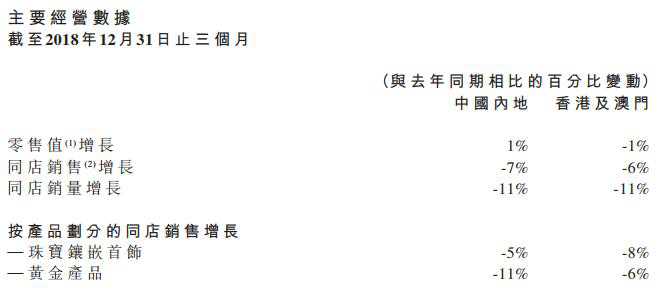 周大福:首个财季内地零售值同比增长24% 净开设115个零售点