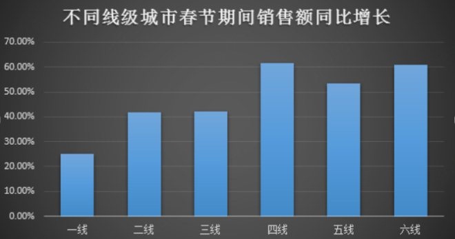在春节期间,来自低线级城市的消费体现出强劲增长力,其中以四线和六线城市的消费增速最高,销售额同比增长超过60%。一方面,在城里打拼的年轻人返乡过年,有效带动了家乡的消费能力;另一方面,电商渠道下沉让越来越多的乡村用户在过节期间也能随时随地享受到电商的便利服务。