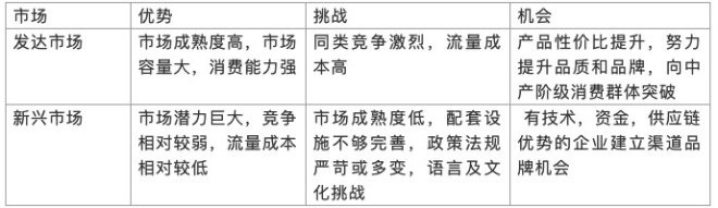 以上我们分析了,有两类不同的市场。接下来我们来看一下,这两类市场对于我们中国出口电商分别有什么机会与挑战。