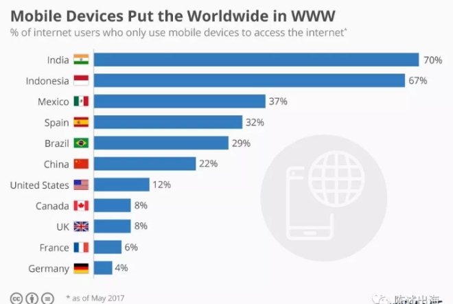 从全球移动互联网接入网络比例统计可以看出,新兴市场,印度,印尼,墨西哥,巴西等国,移动设备都是最主要的网络接入方式。