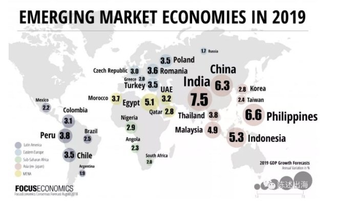 根据 FocusEconomics 的预估,新兴经济体中,南亚的印度,东南亚的菲律宾,印度尼西亚,马来西亚,泰国,中东的埃及,土耳其,阿联酋,卡塔尔,摩洛哥;东欧的波兰,罗马尼亚;南美的哥伦比亚,秘鲁,智利等国2019年的经济增长率都有望超过3%以上。从经济增长率也可以初略看出,出海电商东南亚是和中东是第一第二大潜力市场。紧接着东欧,南美部分国家,也有不错的潜力。