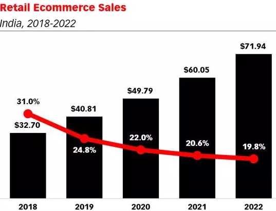 根据 eMarketer 的估计,临近东南亚的印度,跨境电商预计也将在2019年达到400亿美元的市场规模,并持续保持20%以上的增长率。