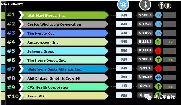 美国一共有79家企业进榜。前十大中美国占了7家,分别是榜首的沃尔玛,第二位的好市多,第三位的克罗格,第四位的亚马逊,第六位的家得宝,第七位沃博联和第九位的CVS药房。