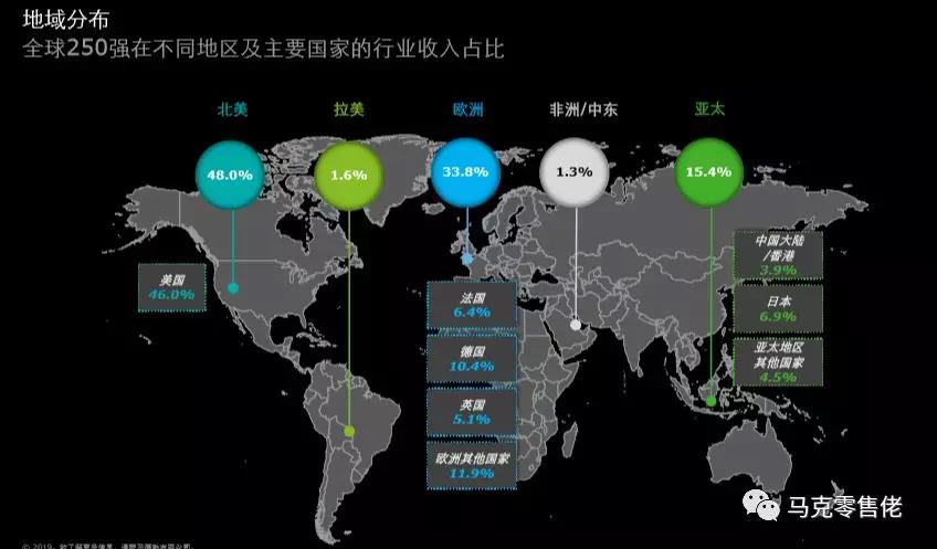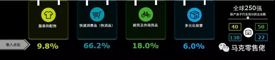 250强中,按产品子品类区分,快速消费品依然遥遥领先其他品类,贡献了66.2%的总零售额(2.999万亿美元)。说明快消品还是前途光明,空间巨大。