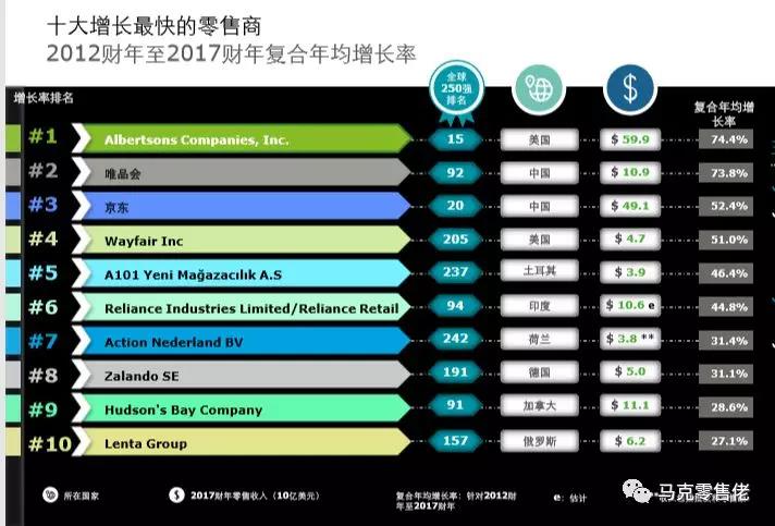 增长最快的十大企业中,来自中国的唯品会与京东位居第二与第三,复合增长率分别达到73.8%与52.4%。然而,唯品会今年拱手让出榜首排名给了美国从事商超业务的Albertsons。