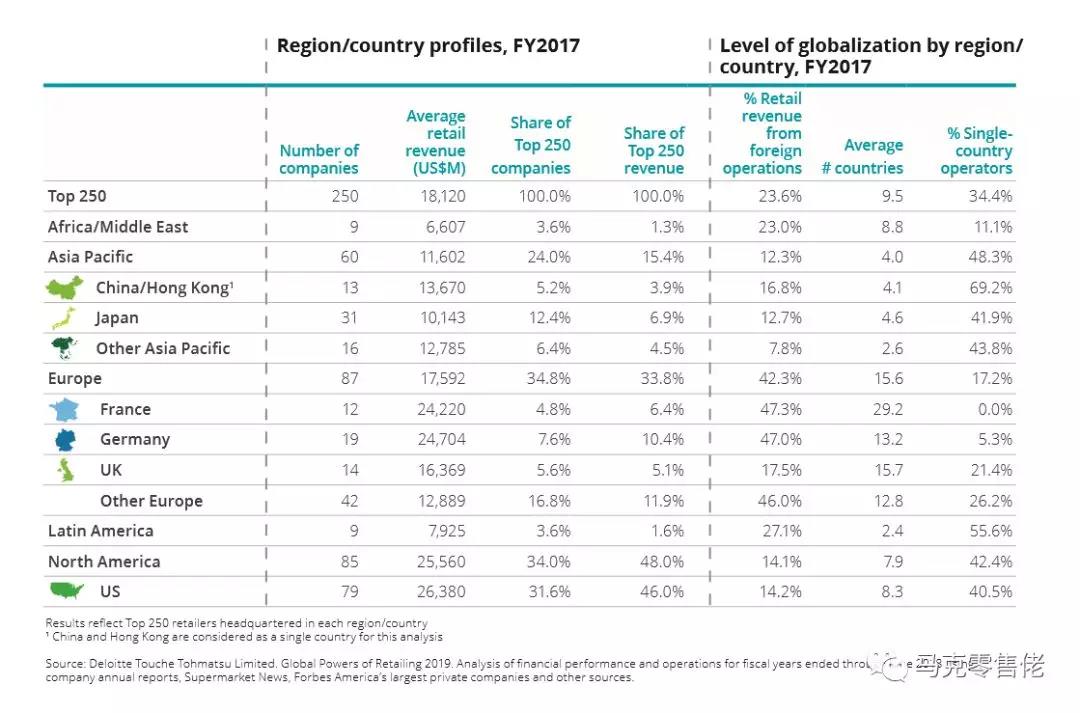 今年二月份,也就是大半个月前,德勤全球如常发布了2019年全球零售力量250强榜单。入选的250强总零售额达到4.53万亿美元,零售收入复合同比增长率达到5.7%,2012-17零售收入复合年度增长率达3.3%,复合净利润率达2.3%。入选企业平均年销售额达181亿美元,250...