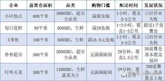 上文介绍了小区快点、U掌柜、朴朴超市、每日优鲜和叮咚买菜这5家前置仓企业,分析对比如下: