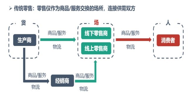 在《AI+新零售,相比于传统零售有什么区别?》一文人货场的传统零售模型中(如下图),人货场彼此由物流、商品、资金流以及固定的场地共同决定,层级跨度较大,市场反馈速度慢,反应周期长,经营成本大。
