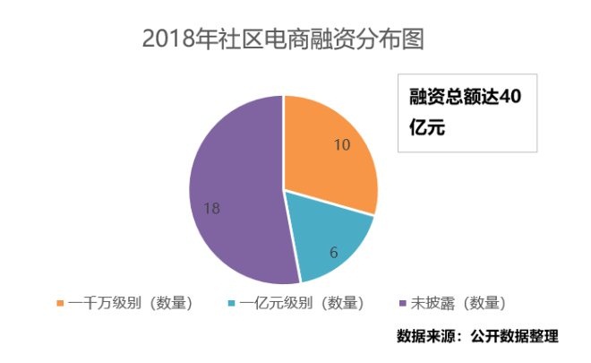 根据公开数据统计,2018年社区电商得到了资本的青睐,融资总额达四十亿元。约有40家具有一定影响力的企业入局,融资情况如图所示,融资总额已超过40亿元,巨额融资已超过6家,头部企业势头很足,其余企业也紧紧地尾随其后。