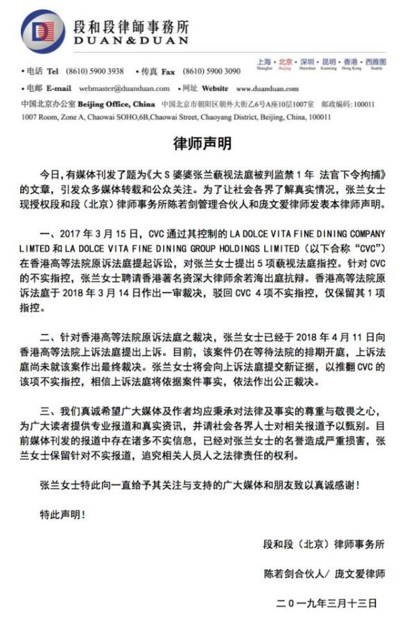 段和段(北京)律师事务所发布的声明表示,2017年3月15日,CVC 通过其控制的LA DOLCE VITA FINE DINING COMPANY LIMTED 和LA DOLCE VITA FINE DINING GROUP HOLDINGS LIMITED(以下合称“CVC”)在香港高等法院原诉法庭提起诉讼,对张兰女士提出5项藐视法庭指控。针对CVC的不实指控,张兰女士聘请香港著名资深大律师余若海出庭抗辩。香港高等法院原诉法庭于2018年3月14日作出一审裁决,驳回CVC 4项不实指控,仅保留其1项指控。针对香港高等法院原诉法庭之裁决,张兰女士已经于2018年4月11日向香港高等法院上诉法庭提出上诉。目前,该案件仍在等待法院的排期开庭,上诉法庭尚未就该案作出最终裁决。张兰女士将会向上诉法庭提交新证据,以推翻CVC的该项不实指控,相信上诉法庭将依据案件事实,依法作出公正裁决。