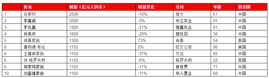 根据榜单,全球十大地产企业家中,7位来自中国,61岁的许家印以2500亿元成为全球地产首富。该榜单在全球共找到239位十亿美金地产富豪,其中中国以58%的占比数据遥遥领先,其次是美国11%和英国7%。
