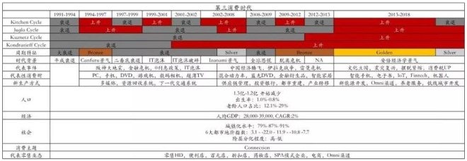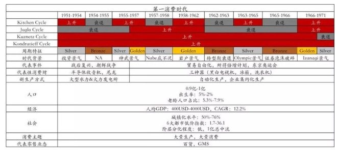 举个例子,上图是用“康波周期理论”复原的日本第一消费时代图。红色区域代表这个周期属于上升阶段,灰色代表衰退阶段。四个周期叠加的地方,就是消费发展的黄金周期。