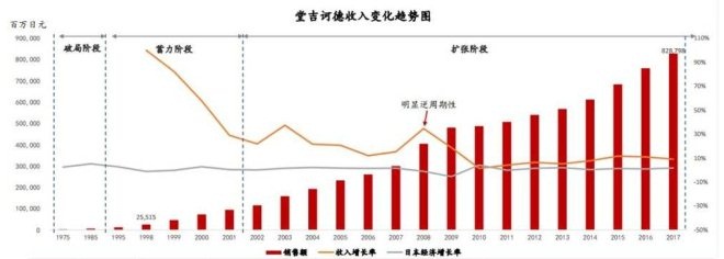 再来看一下堂吉诃德的收入变化趋势,上图中,灰色的线是日本的经济增长率,黄色的线是堂吉诃德的收入增长率。 可以发现,从2008 年开始,它有非常明显逆周期的特点。