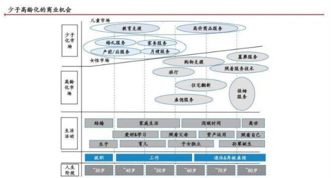 先看“少子化”的结果,教育和高价商品服务市场会变大,因为这个时候可能会变成六个人共同抚养一个孩子,那么这一个孩子可消费的空间就变大了。