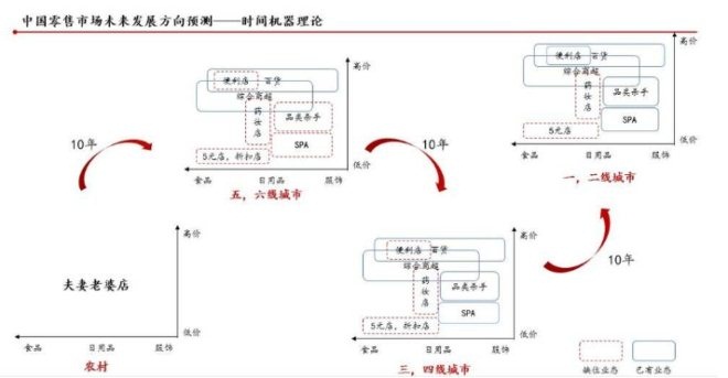 上面这张图是日本目前零售市场的业态地图,基于它和时间机器理论,下图是我对中国零售市场发展的预测。